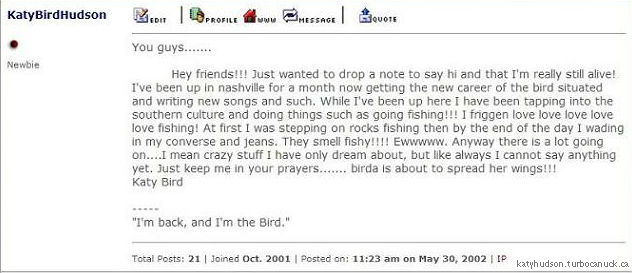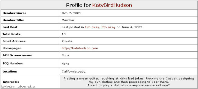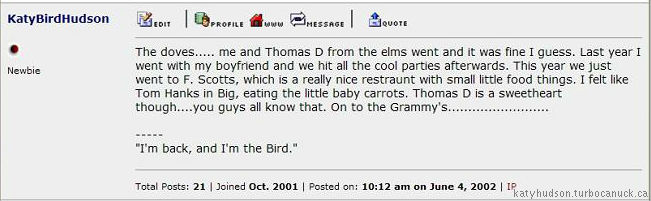 December Katy had a small blurb in Seventeen Magazine! "Katy Hudson is a charming 18-year-o1d singer-songwriter with big blue eyes and messy hair dyed jet-black. She has an effortless star quality, but she's also the kind of girl who makes you feel like her new best friend by whispering secrets in your ear and grabbing your arm to tell you something when she's excited. Katy recently signed with the Island/Def Jam label (ironically, home to Jay-Z and Ja Rule), and she'll be marketed in both the secular and Christian markets. She's worldly and rebellious in a cool-kid kind of way: When some of the cute, tattooed roadie boys walk by backstage, she flirts with them. "Hey, Ethan," she yells. "We're talking about sex!" This gets Ethan's attention. "I love boys," Katy says. "Being 18, you gotta love boys." Katy has a steady boyfriend, but she doesn't believe in sex before marriage. "I know what it does to people," she says. "One night my boyfriend and I went a little too far and I felt like I'd fallen so far away from God. I doubted myself and my strength. I was so weak at the time in my relationship with Christ." If someone is going to have sex, however, Katy absolutely believes that person should use a condom: "Some Christians think that if you use a condom, it's premeditated. So nobody uses a condom at all and they have sex and get pregnant the first time."